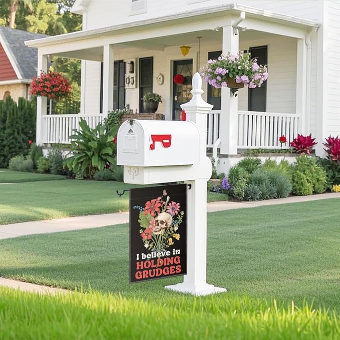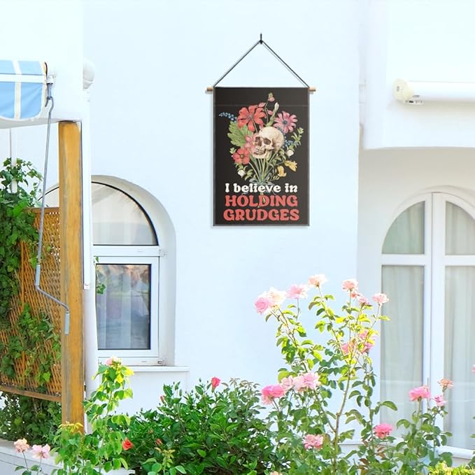 I Believe In Holding Grudges Garden Flag, Funny Floral Skull Halloween Yard Sign for Outside, Sarcastic Skeleton Halloween Decor for Ourdoor Lawn Porch, Inclusive Equality Liberal Fall Banner