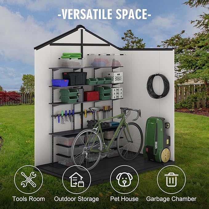- Heavy - Duty Floor: The backyard storage shed comes with a 16mm thick double - layer PVC plastic floor for added protection, ensuring stored items stay clean and dry. This double - layer PVC plastic floor withstands abrasion, supports heavy equipment, and enhances stability on flat surfaces