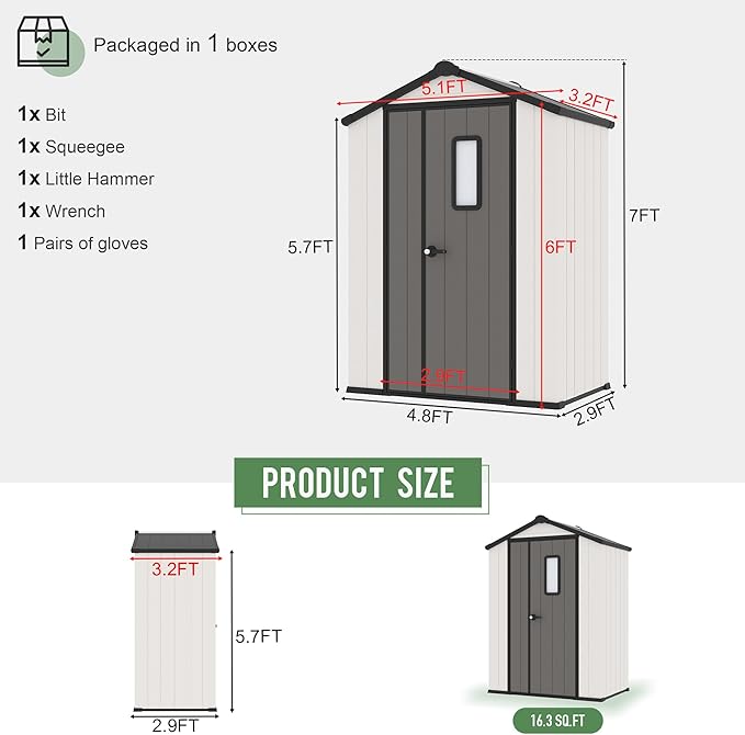 - Spacious Storage Solution: Offering ample internal space,this 5x3 FT storage shed easily accommodates furniture, tools, equipment, and other necessities. Its versatile design allows for use as a workshop, leisure space, or storage area, catering to a variety of needs