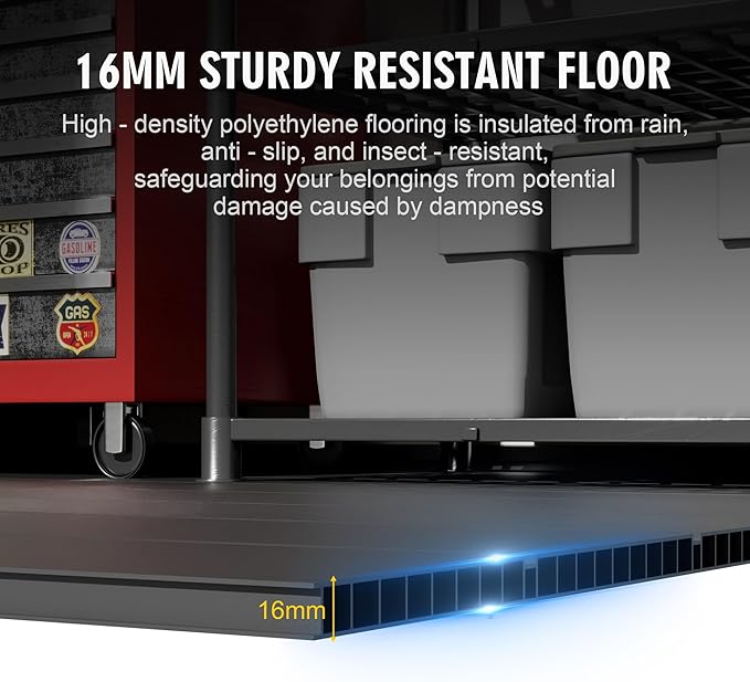 - Heavy - Duty Floor: The backyard storage shed comes with a 16mm thick double - layer PVC plastic floor for added protection, ensuring stored items stay clean and dry. This double - layer PVC plastic floor withstands abrasion, supports heavy equipment, and enhances stability on flat surfaces