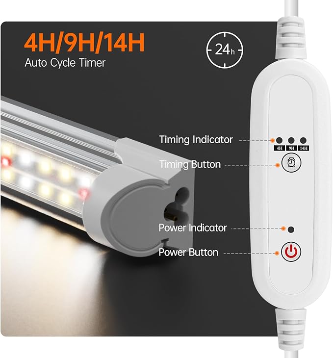 - Convenient Timer Function - The integrated timer feature allows you to effortlessly set the grow light to turn on and off automatically at your preferred intervals (4, 9, or 14 hours). This guarantees your plants receive consistent attention, whether you’re on vacation or busy with work