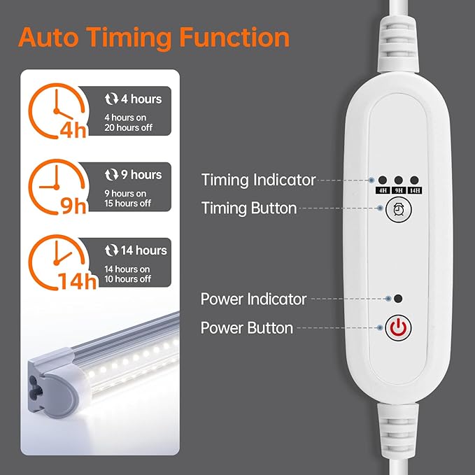 - Convenient Timer Function - The integrated timer feature allows you to effortlessly set the grow light to turn on and off automatically at your preferred intervals (4, 9, or 14 hours). This guarantees your plants receive consistent attention, whether youโre on vacation or busy with work