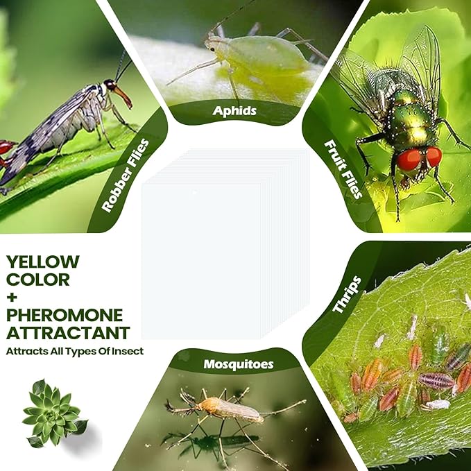 - Double Sided Stickiness: our white sticky traps are designed to be double sided, widely catch the most pests, includes white flies, leaf miners, fungus gnats, shore flies, midges, mosquitoes, and other flying insects, you can place them in the garden, lawn, yard, next to the trash can and so on