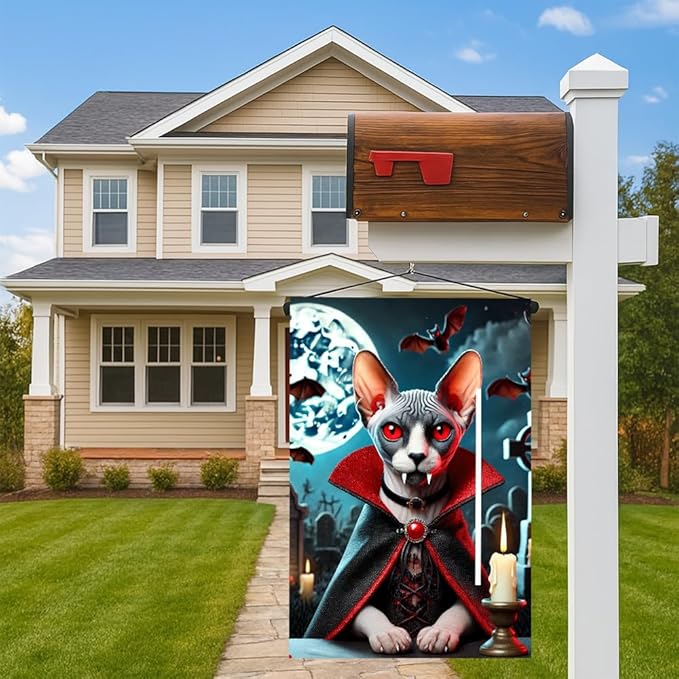 - Unique Halloween Cat Flag: Features a sphynx cat dressed as a vampire with glowing red eyes, sharp fangs, and a dramatic black and red cape.