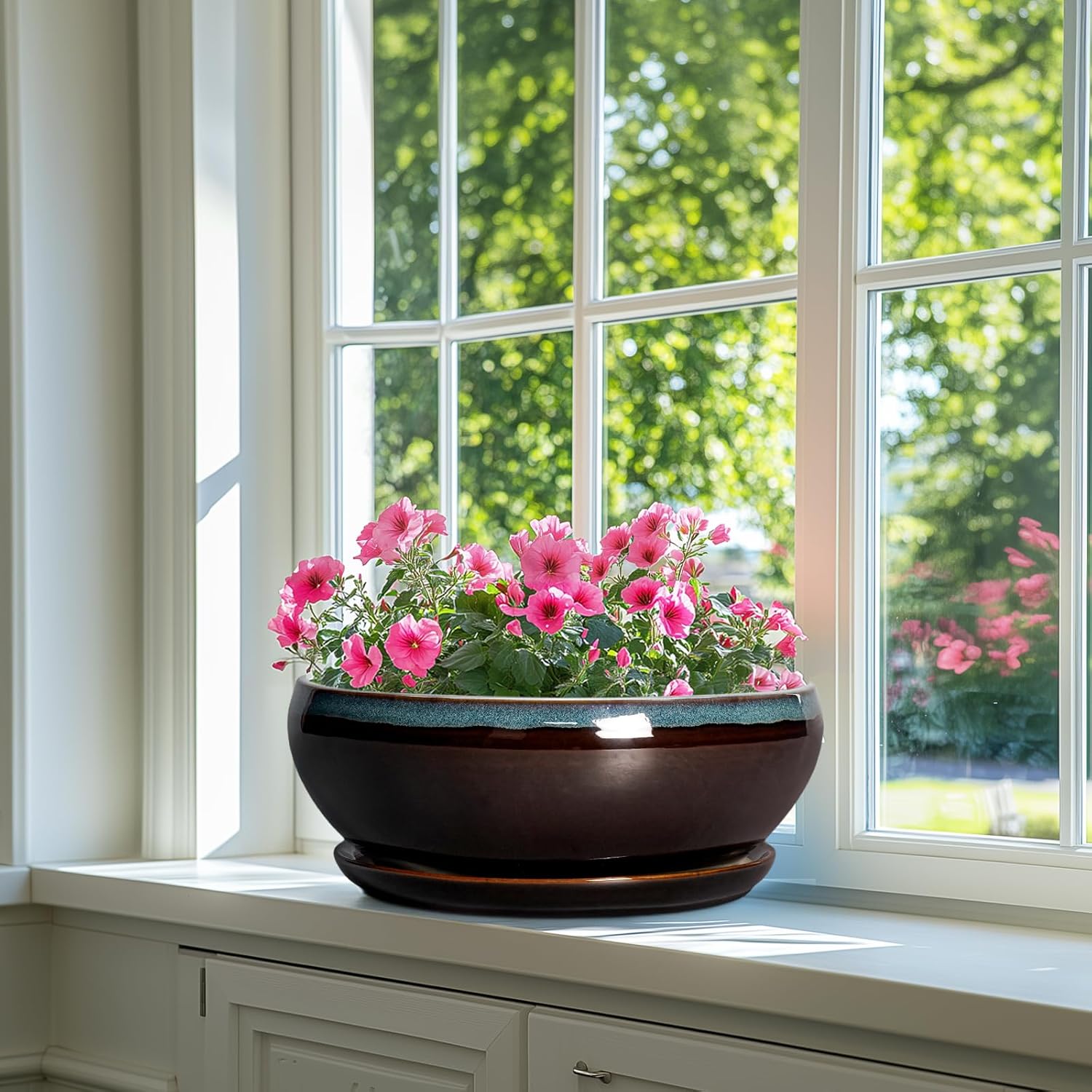 SQOWL Bonsai Planter 12 Inch - Ceramic Succulent Pots Large, Round Shallow Plant Pots Indoor with Drainage Hole and Saucer, Bowl Planter Outdoor for Flower, Room Decor, Housewarming Gifts, Blue-Brown
