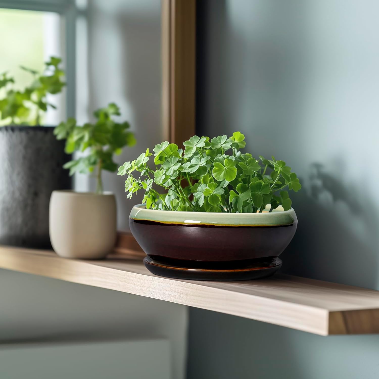 SQOWL Bonsai Pots 8 Inch - Ceramic Succulent Planters with Drainage Hole and Tray, Round Shallow Planter for Indoor Plants, Ceramic Planter Bowl Outdoor, Living Room Decor, Garden Gift, Green-Brown