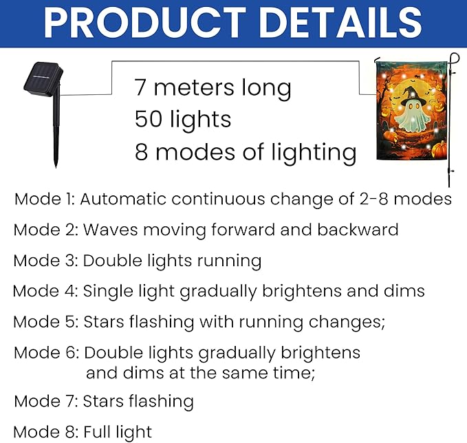 - SOLAR FLAG LIGHTS OUTDOOR β Crafted from durable yet lightweight canvas, these 11.5" x 17.5" Halloween garden flags for outside glow with built-in lights, waving beautifully in the breeze. With double-sided printing and tight stitching, this fall flag adds lasting charm to your Halloween home decor or outdoor decor.