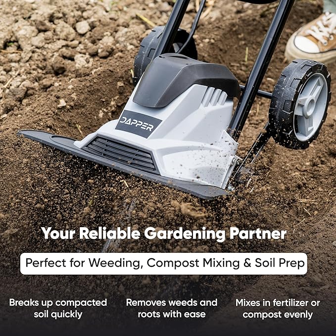 - DEPENDABLE 10‑AMP ELECTRIC MOTOR – The Dapper Supply 14″ electric tiller is powered by a reliable 10‑amp motor, delivering consistent torque and up to 360 RPM to loosen compact soil, mix in compost, and prep beds for planting. A quiet, low‑maintenance alternative to gas, perfect for everyday gardening.