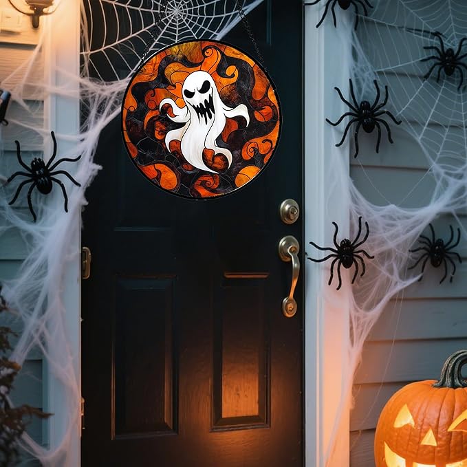 Stained Glass Window Hanging - Halloween White Ghost Suncatcher for Doors Window Garden Indoor Spooky Funny Orange Sun Catchers Gothic Decor Horror Gifts for Women Men Friend 7.8 in