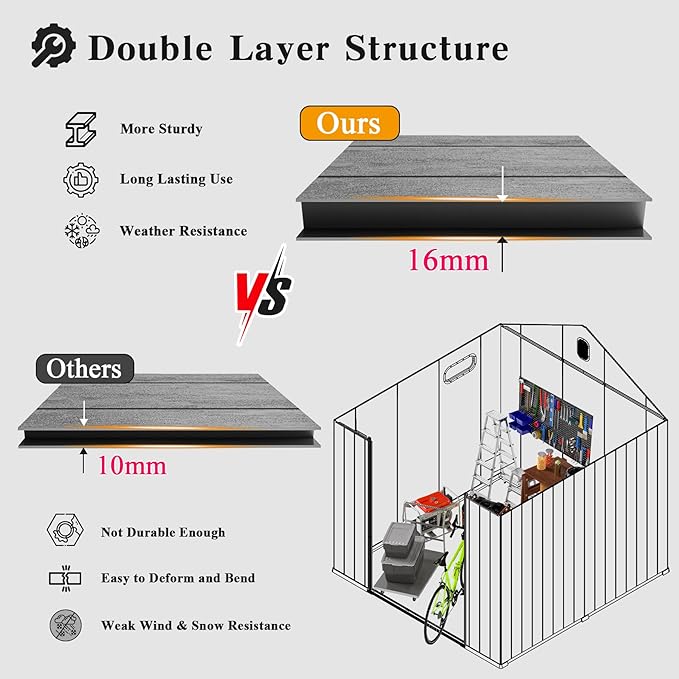 - Durable All-Weather Resin Shed - Constructed with premium double-walled resin panels, this garden shed outperforms metal and wood alternatives. It's UV-resistant, won't rust or rot, and withstands extreme temperatures without warping or cracking - built to last through decades of use.