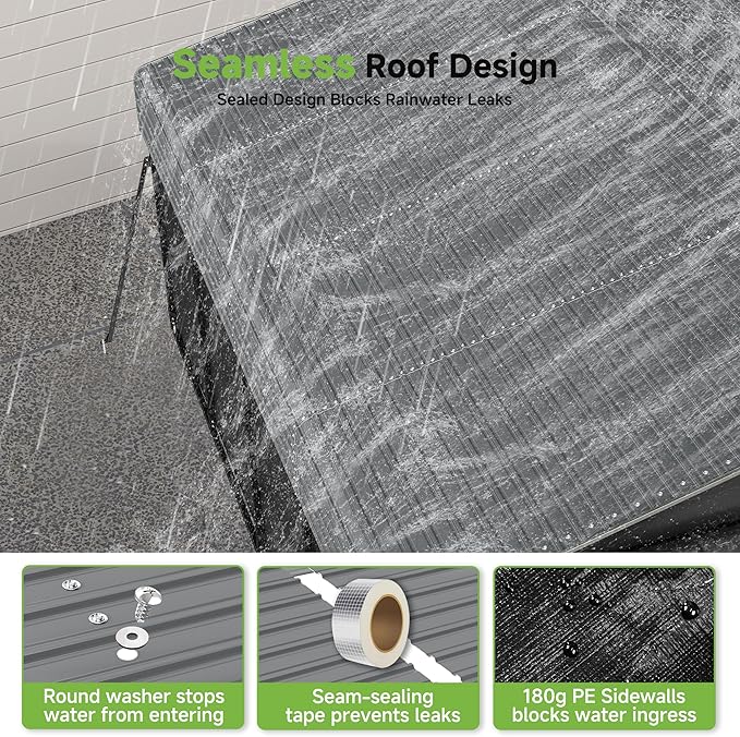 - Waterproof Design: Galvanized steel sheets joined with premium waterproof tape create seamless protection. Reinforced with metal washers at every screw point, ensure complete rainwater blockage.