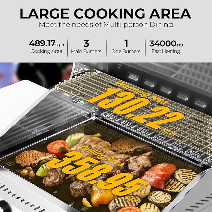 - Spacious Cooking Area & Storage : Offers 489.17 sq. in. total grill space (358.95 sq. in. main grilling + 130.22 sq. in. warming area). Built-in bottle opener, side hooks for tools, and bottom storage keep everything organized.