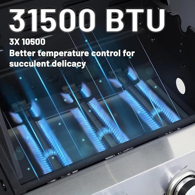 - High-powered Burners: This stainless steel gas grill has 3 main burners (10,500 BTU each) and a side burner (9,000 BTU). 4 burners deliver a total of 40,500 BTU cooking power.