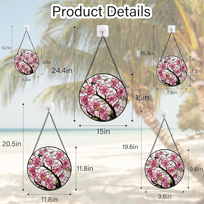 Stained Glass Window Hanging - Cherry Blossoms Birth Flower Suncatcher for Door Garden Patio Sun Catchers Decor Christmas Mother's Day Birthday Gifts for Women Mom Nana Friend Wife 7.8 in