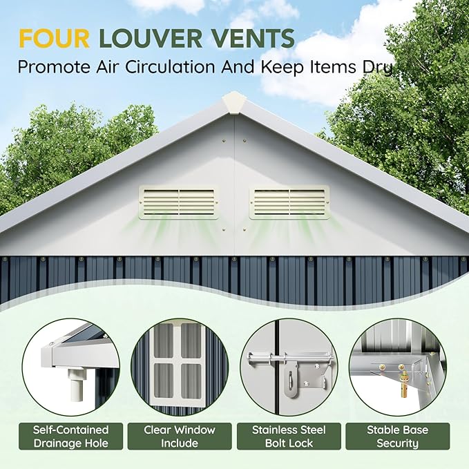 - Durable Construction: Crafted from galvanized steel, this shed is rust-resistant and weatherproof, ensuring long-lasting durability even in tough outdoor conditions.