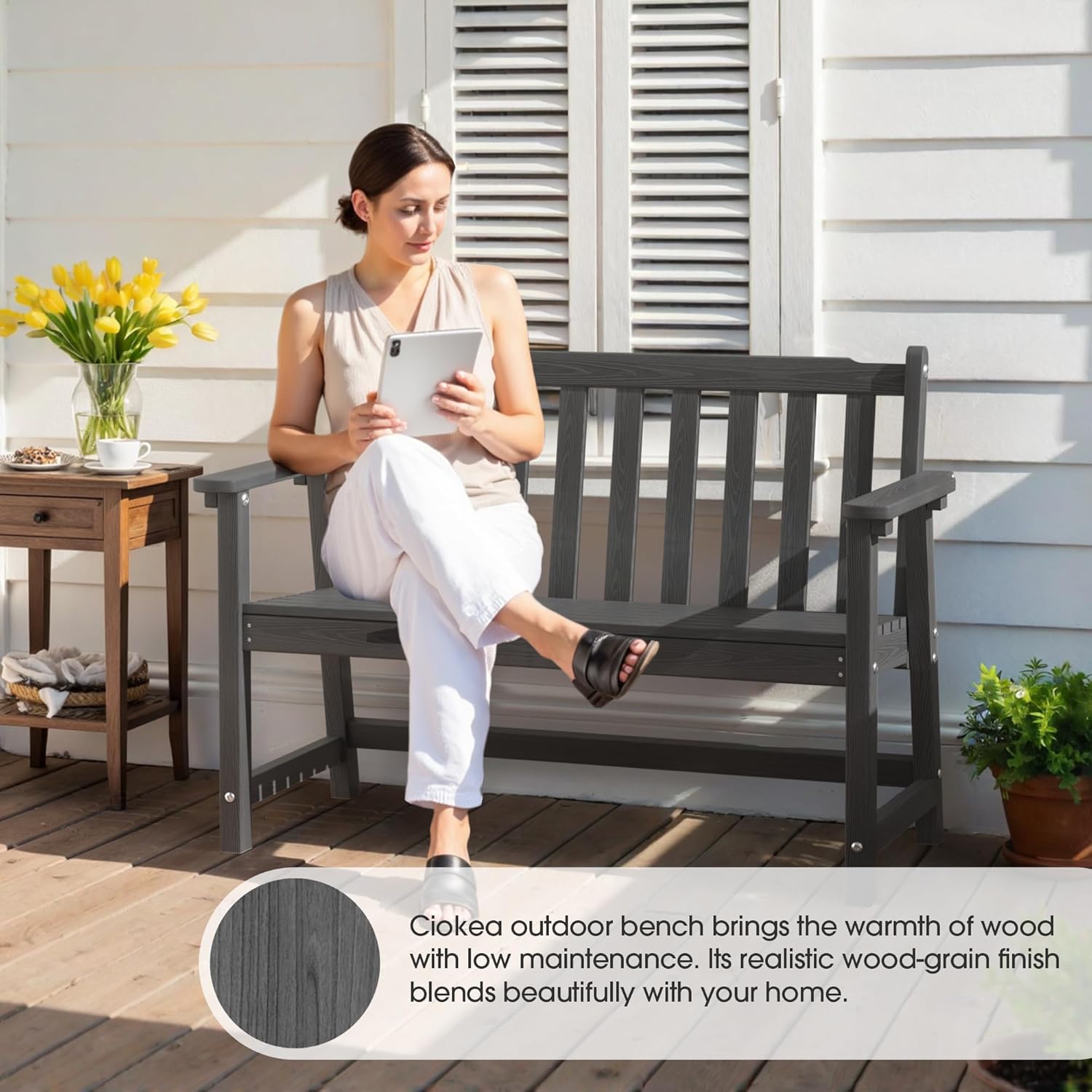 - 【All-Weather HDPE】: Ciokea outdoor bench is constructed from high-density polyethylene (HDPE), ensuring it withstands rain, UV rays, and temperature changes without cracking or rusting