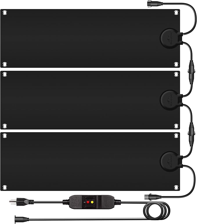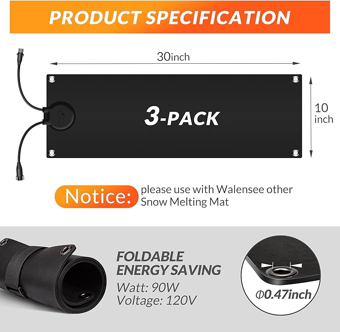 - Easy Installation: These heated mats for snow and ice come with a 11.5 ft power cord, UL-listed plug, leakage protection, velcro straps and working status indicator. Just lay the heated mat flat and plug it into a 120V outlet. You can use it alone or connect two or three mats together. (Caution: total power must not exceed 1500W ). Rustproof grommets are included for secure anchoring, ensuring safety and stability.