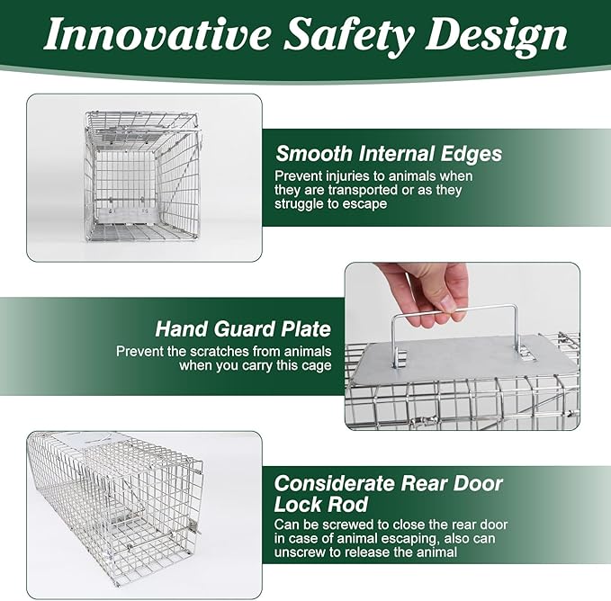 - Solid Construction Cage: Built with sturdy galvanized wire mesh for heavy-duty, long-lasting use. Smooth internal edges prevent injuries to animals and users, while the external trigger rod stays protected from damage by trapped animals. Safe, durable, and reliable for humane trapping needs!