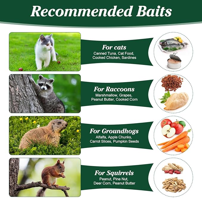 - Wide Applications: Sized at 23.3x7.24x7.72in, this cage is ideal for trapping armadillos, cats, groundhogs, muskrats, nutria, opossums, raccoons, skunks, small dogs, small foxes, and beavers weighing under 4.4lbs. Versatile for humane wildlife control in yards, gardens, or outdoor spaces!