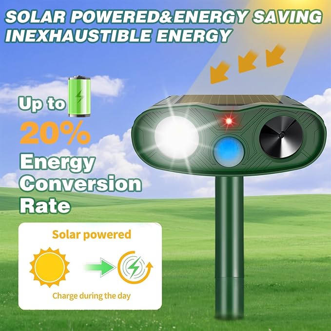 - 🐕Solar Powered: Engineered for continuous, hassle-free outdoor operation. The cat repellent outdoor integrated high-efficiency solar panel converts sunlight into stored energy, significantly minimizing reliance on conventional batteries. Constructed from robust, high-strength ABS material, this deer repellent withstands any weather conditions—rain, snow, and high temperature temperatures—ensuring reliable, year-round performance and extended durability.