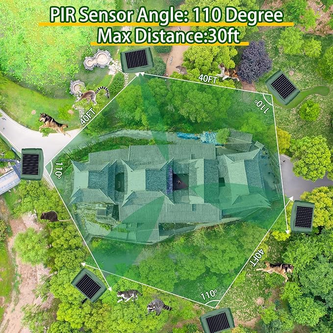 - 🦌Wide Coverage & Simple Setup: The rabbit repellent outdoor features a broad 110-degree infrared detection angle with a range extending up to 30 feet, effectively covering large areas based on animal size. Fully charge the solar panel under direct sunlight for 2-3 hours before initial use. Mount the bird repellent devices outdoor securely, approximately 9-10 inches above ground level, ensuring direct sunlight reaches the panel and positioning it to cover the desired protection zone.