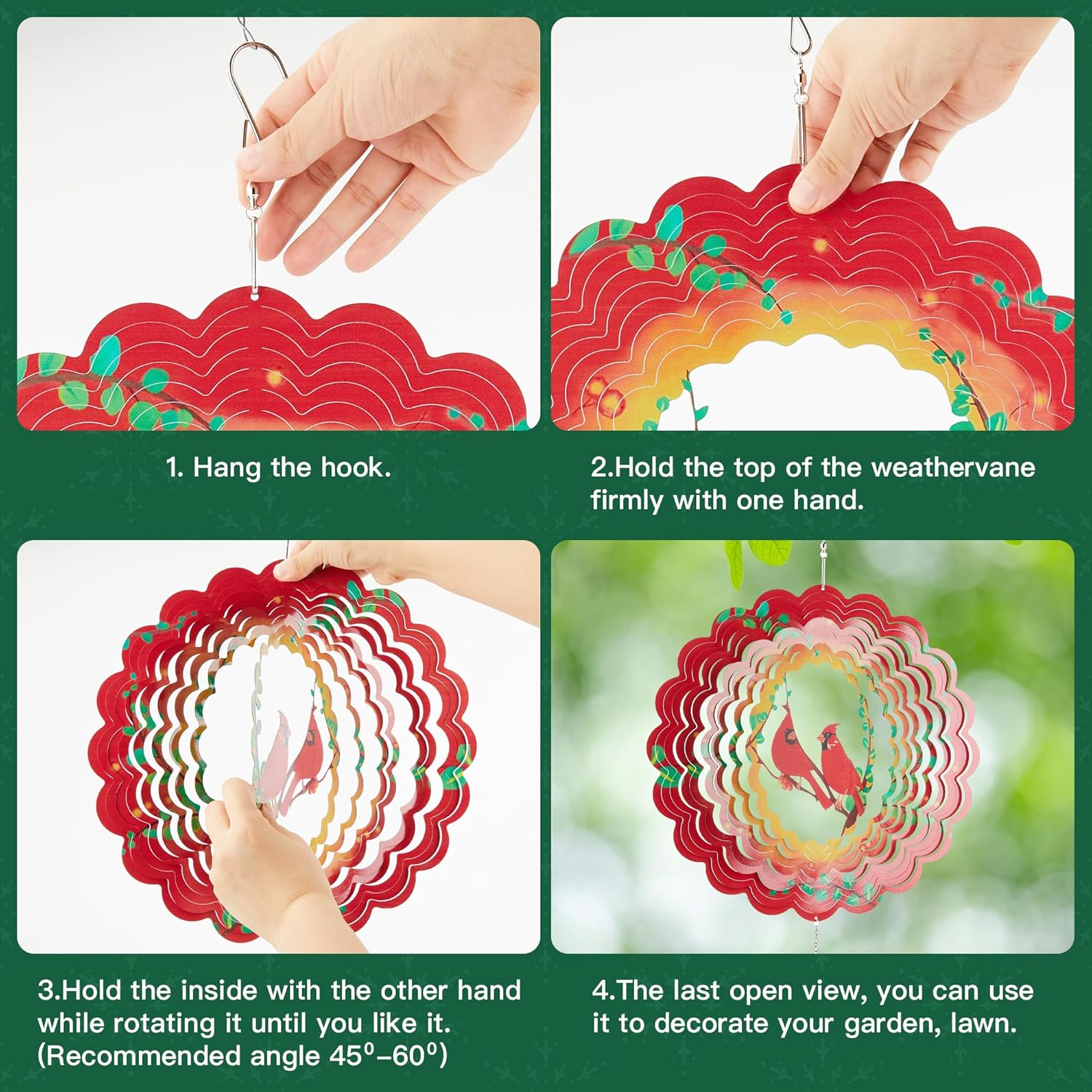 - Easy to Use: The initial state of this garden wind vane is flat. Just follow the instructions to turn it into a wonderful 3D sculpture decoration. The method is as follows: Hang the hook and hold the top of the wind spinners firmly with one hand while rotating it with the other until you reach your desired angle (suggested angle: 45β60Β°).