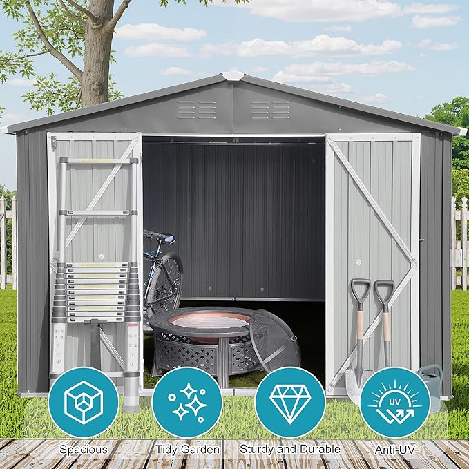 10x12 FT Outdoor Storage Shed, Metal Tool Shed with Lockable Doors & Peaked Roof, Garden Shed with Vented Design for Backyard Garden Patio Lawn, Gray