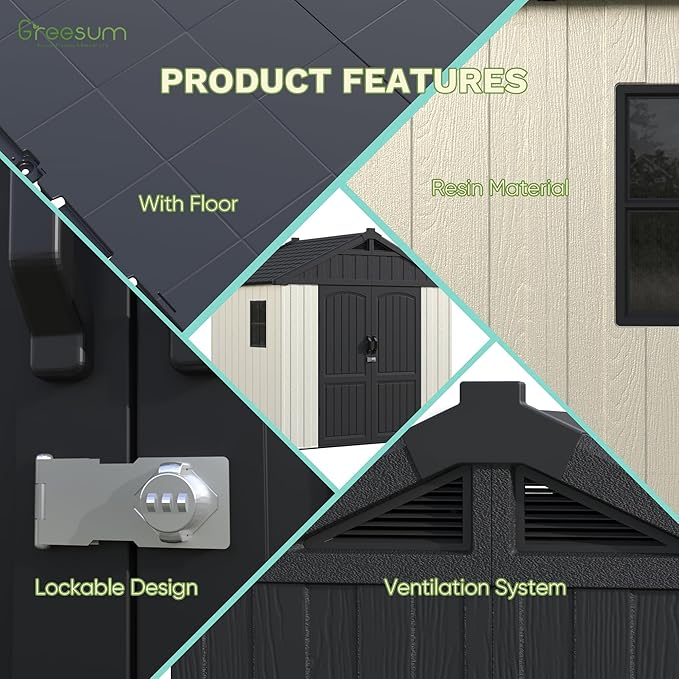 Greesum 8×6 FT Plastic Outdoor Storage Shed with Floor, Resin Sheds with Window and Lockable Door, Weather Resistant Organization for Garden, Lawn, Pool Supplies, Beige
