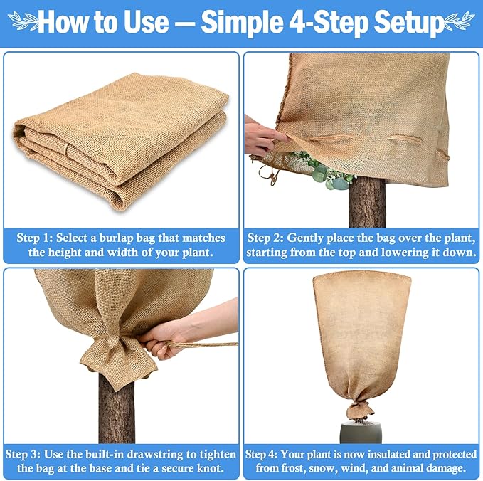 - Plant Covers Freeze Protection: Our burlap winter plant cover bags are lightweight and won't crush plants, and it have excellent breathability, allowing sunlight, air and moisture to penetrate, ensuring that they keep warm without suffocating, also maintaining moisture, providing a comfortable growth environment for plants. We suggest that you choose a sack size larger than the plant to meet the growth requirements.