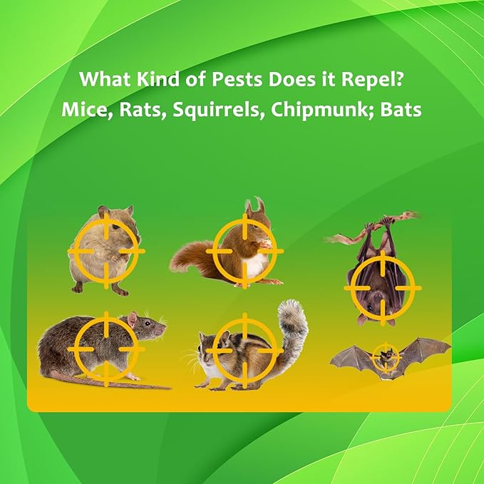 - Place the ultrasonic pest repeller rat repellent in the attic, garage, basement, room, storage room, crawl space, recreational vehicle, or any indoors 100-240v available; Save your money for rodent control, and prevent your property in mice damage, deterring squirrels, mice, rats, bats, and critters out of your home, get peace of mind by it