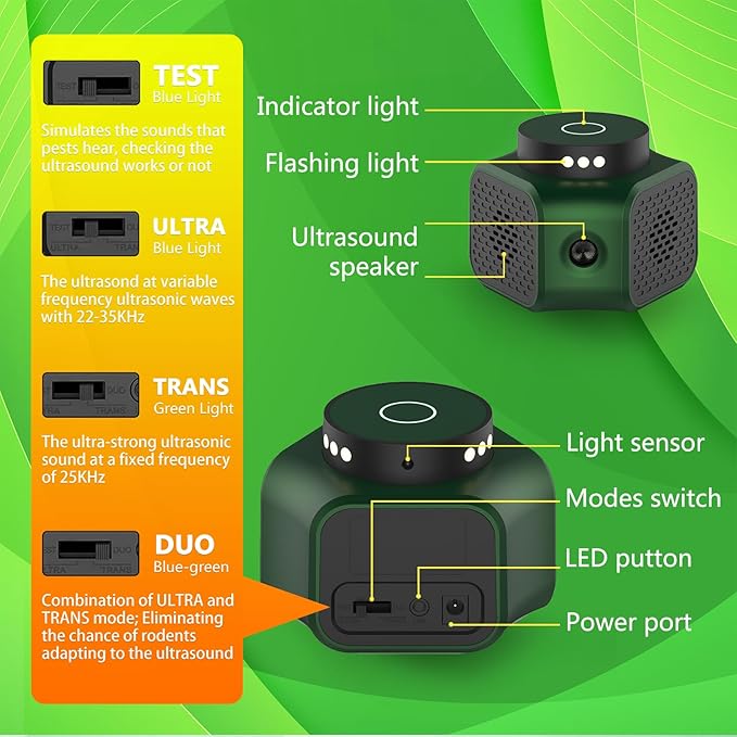 - Manually switch the deterrent modes to achieve the pest control target you want; The mice and rat repellent plug-in is designed with types of rodent-repelling-mode, preventing rodents and critters from getting used to the same mode; Choose mode ultra, mode trans, or mode duo to keep squirrels, mice, rats, bats, and critters at bay in an easy way