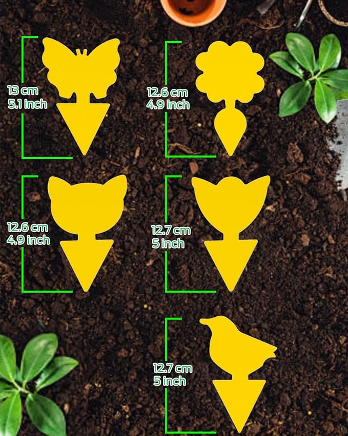 - [Package Included] 50pcs gnat sticky traps for plants. There're 5 shapes, eash shape has 10pcs plant bug sticky traps indoor.