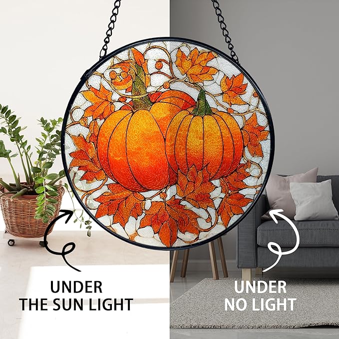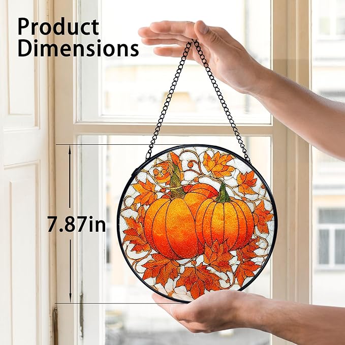 TNUW Fall Autumn Pumpkin Stained Glass Window Hanging, Farmhouse Autumn Pumpkin Maple Leaf Sun Catchers Indoor Window Glass Round Wall Art Decor, Rustic Fall Wall Hanging Decorations, 7.9"x7.9"