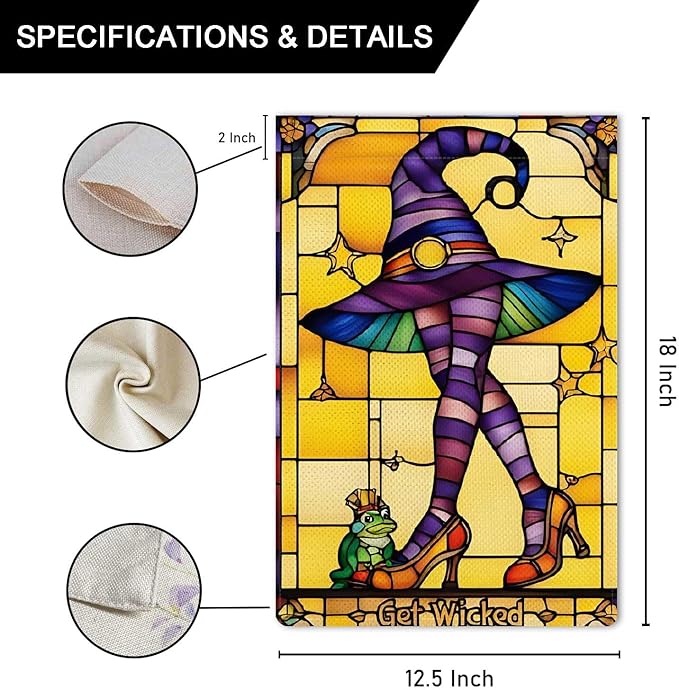 Get Wicked Garden Flag Witch Hat Holiday Garden Flag The Frog Prince Stained Glass Style Vertical Double Sided Rustic Farmland Burlap Yard Lawn Outdoor Decor 12.5x18"
