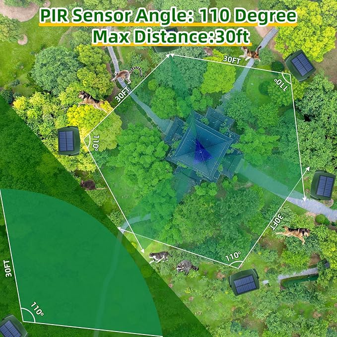 - ✔️【Effective Cat Repellent】The cat repellent outdoor is only to drive the animal without any harmful substance.Cat deterrent outdoor is only issued 13.5kHz-45.5kHz ultrasound to drive them away.It has the ultrasonic system,triggering at a 110° angle and a distance range of 26-33 feet for optimal performance.Will not have any harm to the human body. And will not hurt your own cats,dogs or other pets.