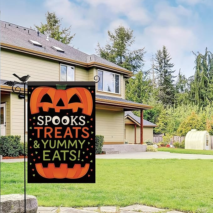 - Fun Halloween Message Design: This garden flag features a playful "Spooks, Treats & Yummy Eats!" design with a large pumpkin, ideal for adding a festive vibe to your Halloween yard decor.