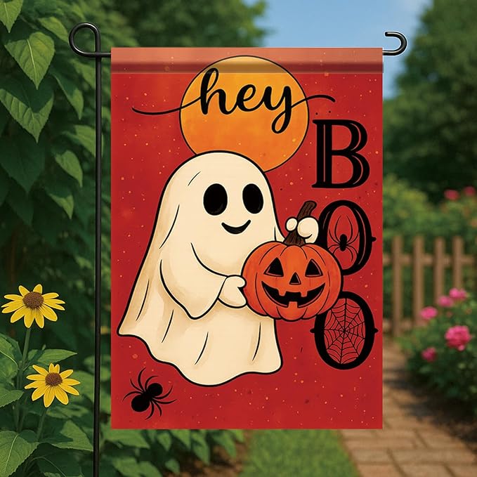 - High-Visibility Double-Sided Print: The 12x18 inch double sided flag design ensures the ghost, pumpkin, and "Hey Boo" message are clearly visible from both sides, creating a charming addition to your Halloween outdoor displays.