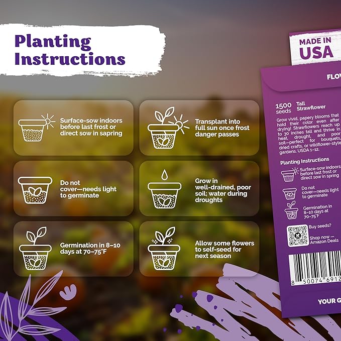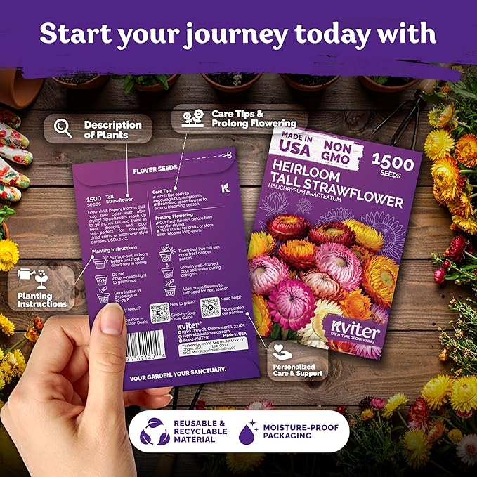 KVITER 1,500 Tall Mix Strawflower Seeds for Planting (Xerochrysum/Helichrysum Bracteatum) — Golden Everlasting Flower, Paper Daisy — Ideal Organic, Heirloom Cut Flower Seeds to Plant Outside & Drying
