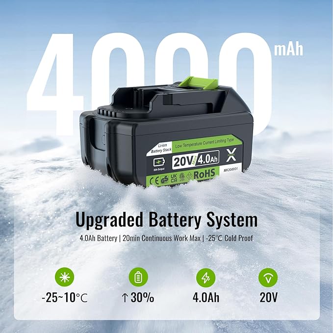 - 🌨️ 【Excellent Cold Weather Performance】The battery powered snow blower works from -25℃ to 10℃ – outperforms in icy conditions. Built-in battery protection safeguards against low/high temps, over-current, short-circuit, over-charge, and over-discharge.