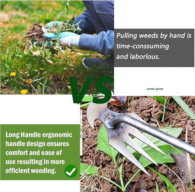 - 【Multifunctional Garden Tool】This tool is designed to handle weeding and digging tasks in gardens, yards, or farms. It's the ultimate companion for gardening and farming. It's incredibly easy to use. Simply insert the four sharp teeth into the soil when pulling out grass. Make sure the root of the grass is as close to the bottom of the groove as possible to facilitate the removal of weeds in corners and narrow spaces.
