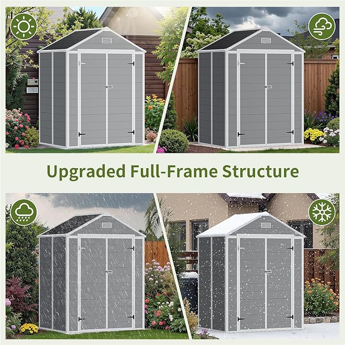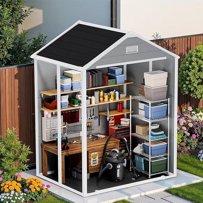 - Sleek Grey Design with Hardworking Sloped Roof: The classic grey finish blends seamlessly with gardens, patios, or backyards, adding subtle style to functionality. Its steeply sloped roof isn't just for looks— it accelerates rain/snow runoff, preventing buildup and reducing long-term wear, so your shed stays sturdy through storms and winters.