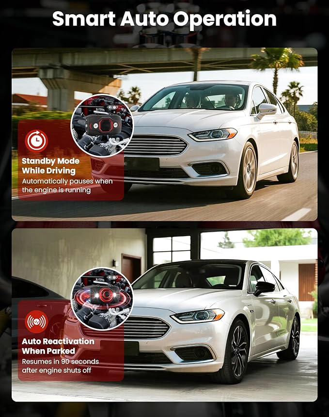 - 【Smart Auto On/Off】: The built-in intelligent activation system detects engine activity and pauses the device automatically when your car is running. It resumes operation 90 seconds after the vehicle is turned off, conserving power and extending battery life without manual intervention.