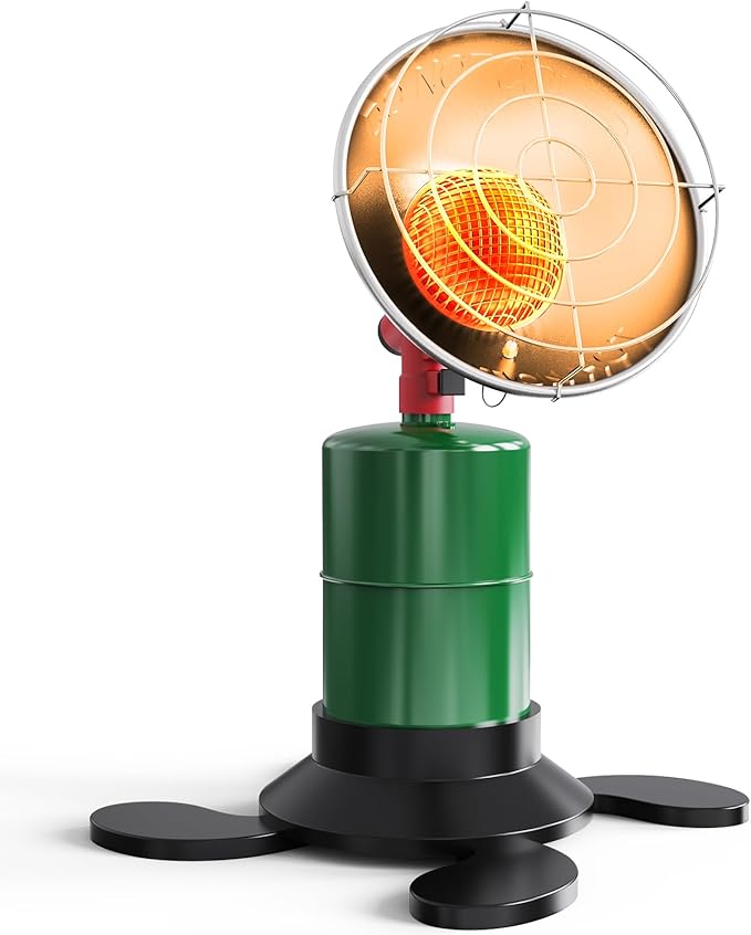 - Stable Foldable Base: This device has a foldable base (No tank Included) that can be unfolded to ensure the fuel tank is stable and upright, effectively preventing tipping over and accidental leakage. When not in use, the base can be folded up for easy storage and carrying. It is suitable for heating needs in various occasions such as camping, hunting, ice fishing, golf carts, etc.