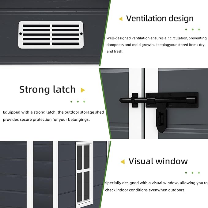 - [ECO-FRIENDLY RESIN MATERIAL]:Our storage shed is made of high-quality resin material, which is environmentally friendly and durable. Resin material is corrosion-resistant, waterproof, rust-proof, and UV-resistant,and has low maintenance costs.