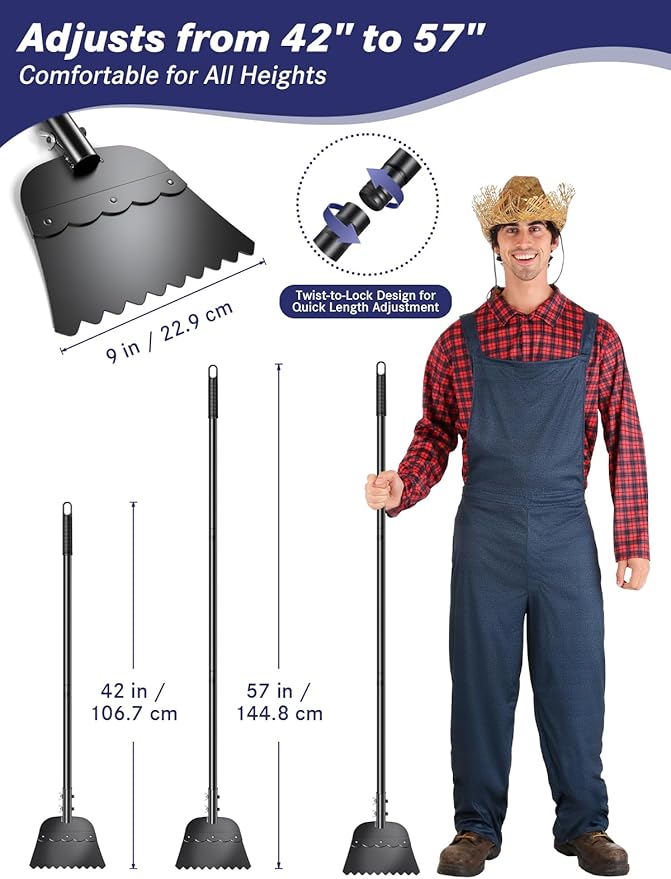 - 【Adjustable Long Handle Shovel】 The 3-section threaded handle adjusts to different lengths, extending up to 57 inches. This flexibility lets you choose the right reach for each task, whether scraping floors, digging in the garden, or chopping driveway ice. Compared to short-handled tools, the adjustable design offers better leverage, wider coverage, and greater efficiency.