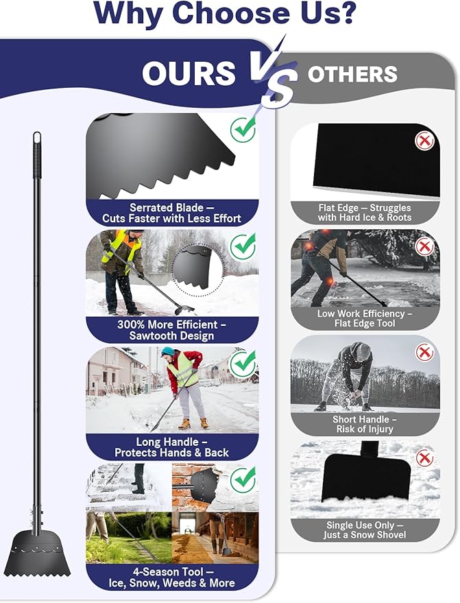 - 【All-Season Snow Shovel and Garden Tool】 This multifunctional tool works as a snow shovel, ice scraper, ice chopper, weed remover, garden hoe, and floor scraper. Clear driveways and sidewalks in winter, then use it for gardening, root cutting, edging, and debris removal in warmer months—a reliable tool for year-round outdoor maintenance.