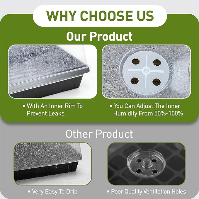 - 【Extra Thick & Leakproof 1020 Trays】Each 1020 tray is crafted from ultra-durable, reinforced plastic that supports up to 77 lbs without bending or cracking. The solid, no-hole base prevents leaks and retains moisture—ideal for consistent seed germination and long-term use in any growing environment.