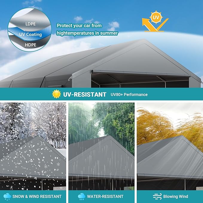 - 【Heavy Duty Carport】The carport canopy is made of 180 grams PE tarpaulin with industrial grade galvanized steel and reinforced crossbars, with artfully welded frame joints. It can withstand wind gusts of over 55 MPH and protects your car or boat from sun, rain and UV rays.