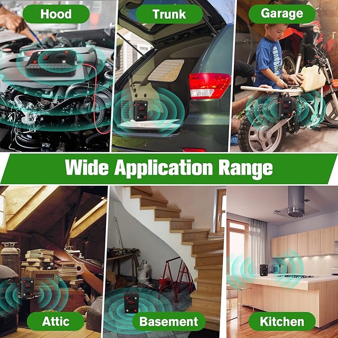 - The Gift To Protect Your Family: Have you or your family members ever had these troubles, nasty mice running around in the kitchen and basement, squirrels nesting in the car, mice biting the car wires, etc.? Our ultrasonic rat repeller is your best choice! Use humane methods to drive away rodents by using ultrasonic waves, LED strobe lights and alarm sounds, and easily protect the living environment of you and your family