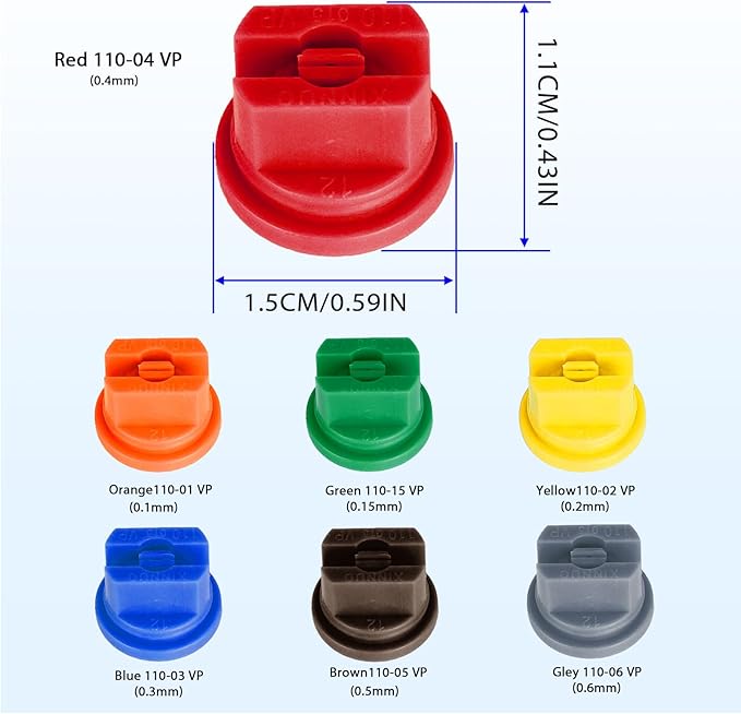 - 【7 Sizes in One Set】 – Includes 7 flat fan nozzles in different flow rates (0.1–0.6mm), each with a color code (Orange/Green/Yellow/Blue/Red/Brown/Grey) for easy identification. Perfect for weed control, fertilizing, watering, and more.